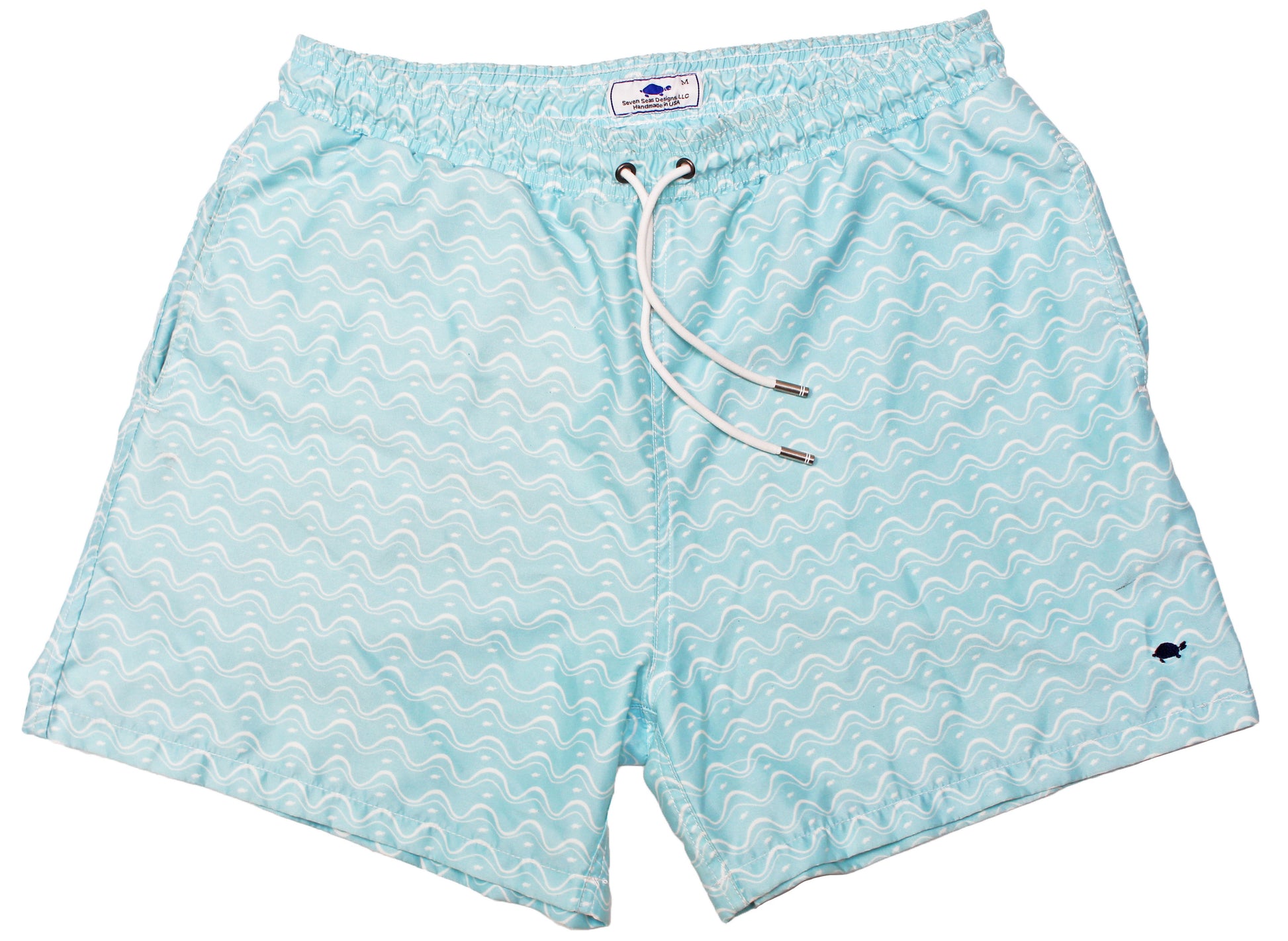 This is our prototype short featuring a splash proof pocket made from neoprene. Custom hand drawn designs, drawstring and metal endings. 3 pockets for convenience with elastic waistband for flexible comfort.